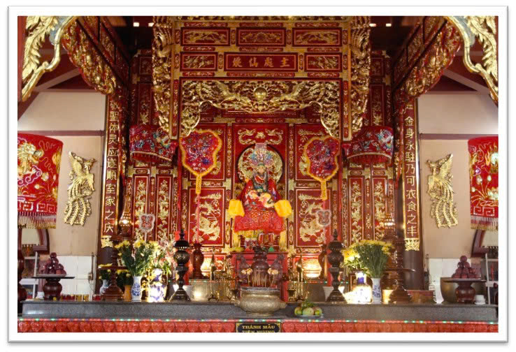 Võ ca và phủ qui không xây vách, tạo không gian rộng rãi, thoáng mát, thuận lợi cho các hoạt động lễ hội và khách quan lễ bái. Uy nghiêm và trang trọng nhất là gian chính điện. Tại vị trí trung tâm, sát vách hậu đặt tượng bà Thánh Mẫu Tiên Nương, quanh tượng trang trí đèn pha lễ mạ đồng, tỏa sáng huyền nhiệm, sắc màu lấp lánh thể hiện uy linh nơi Bà tọa vị. Bệ thờ tôn trí các vật thờ: long đăng, chò quả, bộ lư, chuông, bộ lỗ bộ, cặp qui đội hạc, lộng, bình hoa … Phía trước bàn thờ Bà trang trí bộ bao lam chủ đề song phụng chầu hoa sen, tươi màu sắc nét, làm tăng thêm nét thấm mỹ trong nội thất đại điện.